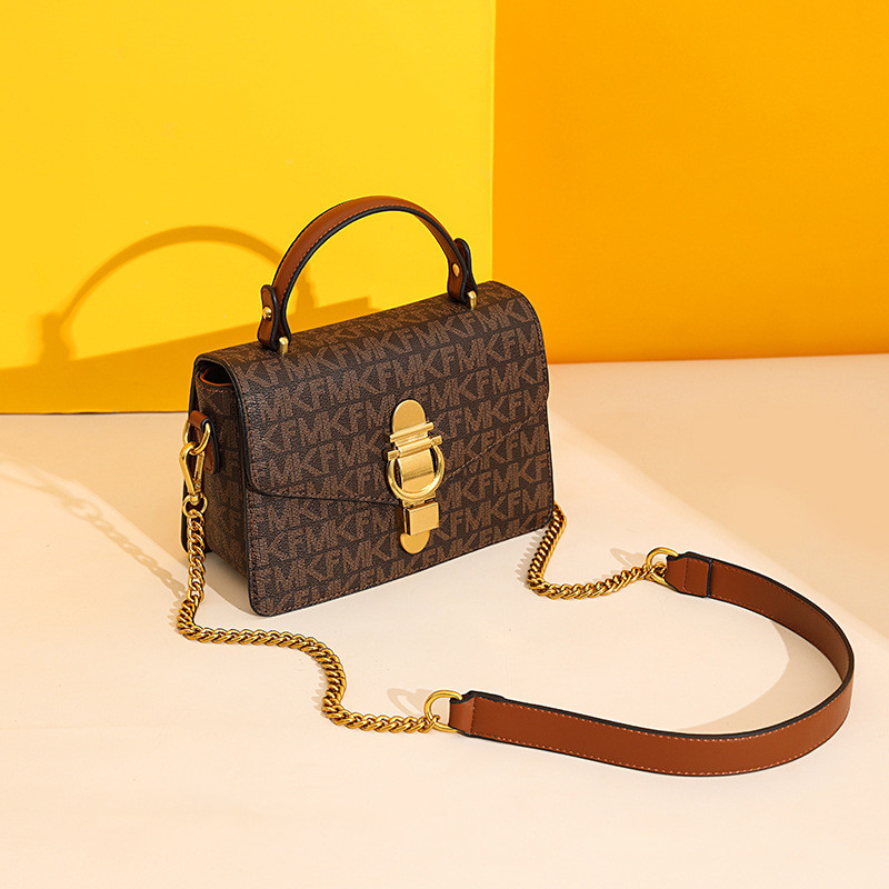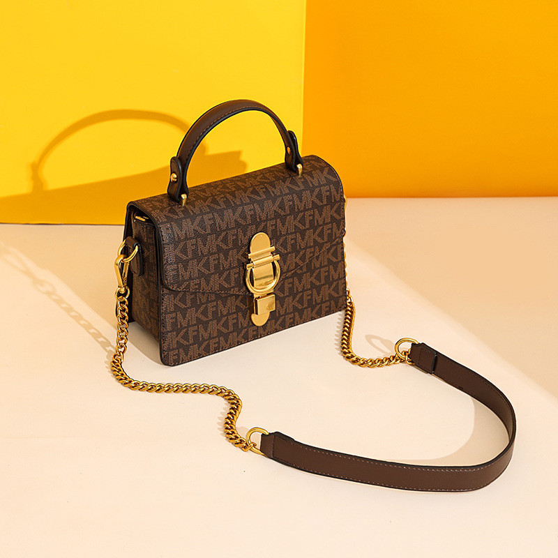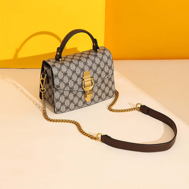 Diseño: Bolso cuadrado pequeño con estampado decorativo y cadena metálica, ideal para looks elegantes y urbanos.